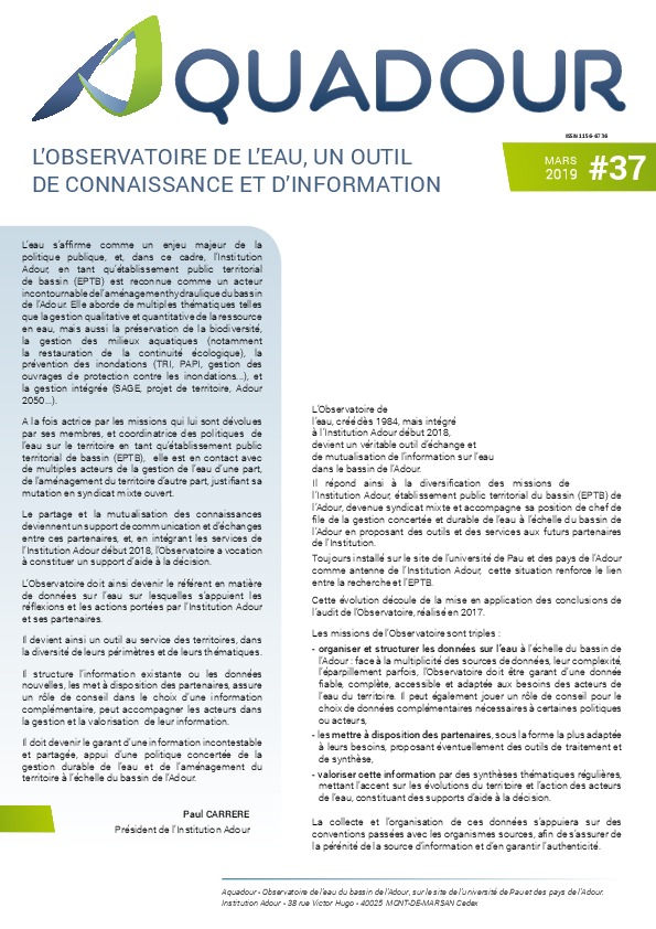 Intégration de l'Observatoire de l'eau du bassin de l'Adour au sein de l’Institution Adour, évolution et mission. Différents chantiers de l'Institution Adour