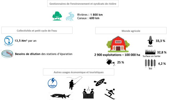 Le territoire de l'Adour en amont d'Aire rassemble des acteurs variés ayant des besoins vis-à-vis de la ressource en eau, qu'ils soient préleveurs ou non.