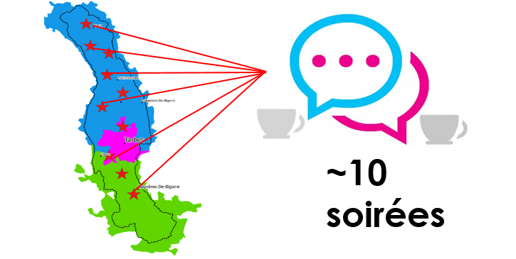 Des cafés-débats sont organisés dans le cadre du projet de territoire pour la gestion de l'eau de l'Adour amont. L'objectif est d'impliquer le grand public dans l'élaboration du projet de territoire à travers la découverte des différents usages de l'eau et de son partage entre les Pyrénées et Aire sur l'Adour, dans un contexte de changements climatiques. Ces événements ont eu lieu à l'été 2019 dans différents cafés du territoire, en soirée.