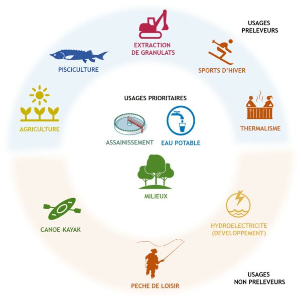 Le territoire du projet présente une variété d'usages importante liée aux spécificités des différents sous-bassins (topographie, réseau hydrographique, etc.). Outre les usages prioritaires que constituent l'alimentation en eau potable, la salubrité publique et les milieux naturels, de multiples usages préleveurs (agriculture, industries, tourisme) et non préleveurs sont présents sur le territoire et ont des attentes variées vis-à-vis de la disponibilité en eau. Ces attentes peuvent porter sur la quantité de ressource disponible (en volume ou en débit) ou sur la régularité de la ressource et être influencées par d'autres facteurs, comme la qualité de l'eau et le bon fonctionnement des milieux.