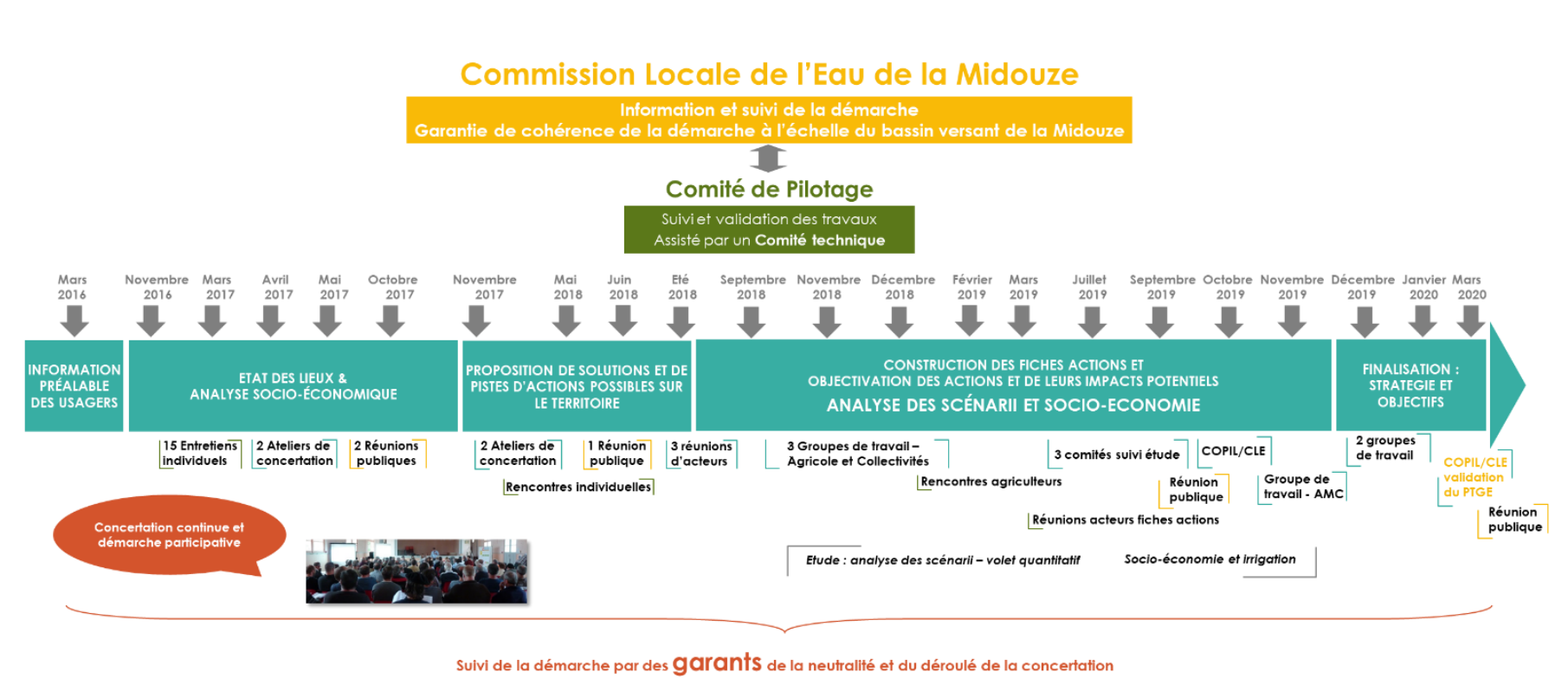 Cette démarche a débuté en mars 2016 par des réunions d'informations préalables aux usagers et s'est poursuivie par l'élaboration concertée de l'état des lieux du territoire, validé à l'unanimité par le comité de pilotage en 2017.