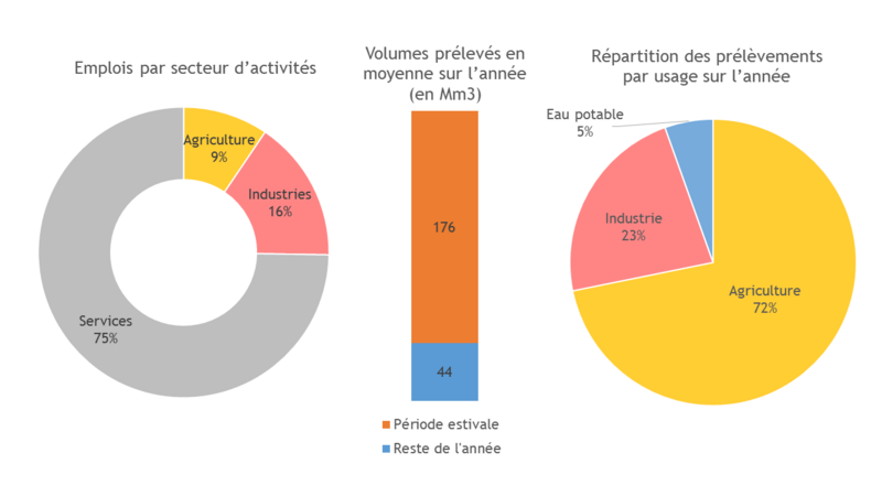 Sur le territoire, les activités industrielles (agroalimentaire, aéronautique, extraction de granulats, métallurgie et chimie essentiellement) représentent environ 15 % des emplois et exercent principalement des pressions qualitatives sur la ressource, les prélèvements d’eau réalisés étant presque intégralement restitués au milieu aquatique.