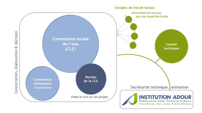 Depuis l’installation de la CLE, la structure porteuse du SAGE de l’Adour amont est l’Institution Adour, l’établissement public territorial du bassin de l’Adour.
