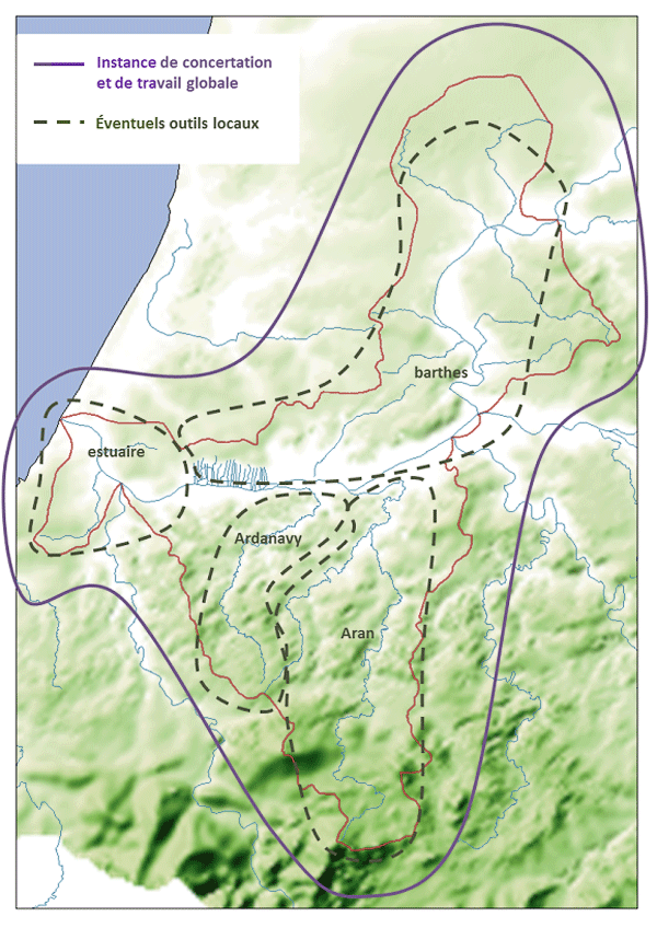 Cette idée vient en complément du projet d’émergence d’un SAGE Adour aval, qui serait un outil de concertation et de gouvernance à mettre en place à une échelle élargie, avec une portée règlementaire plus importante, et sur des points stratégiques et de long terme, moins opérationnels qu’un outil de type contrat.