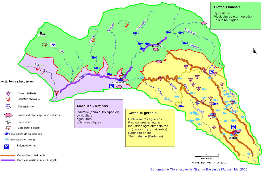 Économie : l'agriculture est un usage économique prédominant sur le bassin, la sylviculture avec la forêt landaise et l'activité piscicole avec la présence d'une soixantaine de piscicultures sont également développées sur le bassin. L'industrie est aussi présente, au niveau des grandes agglomérations (Mont-de-Marsan essentiellement) et du secteur du Retjons à l'aval du bassin (Rion-des-Landes, Tartas). Le tourisme trouve sa place avec les thermes de Barbotan (Gers), les parcours canoé entre Arue et Tartas (Landes) et les zones de baignades (lac d'Arjuzanx, base de loisir à Saint-Pierre-du-Mont dans les Landes et lac de la forêt à Aignan, lac de l'Uby dans le Gers).