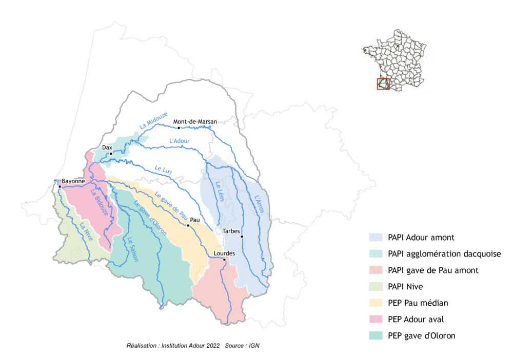 De nombreux dispositifs PAPI et PEP (programmes d'études préalables aux PAPI) existent sur le bassin de l'Adour, qu'ils soient en phase de mise en œuvre ou d'élaboration.