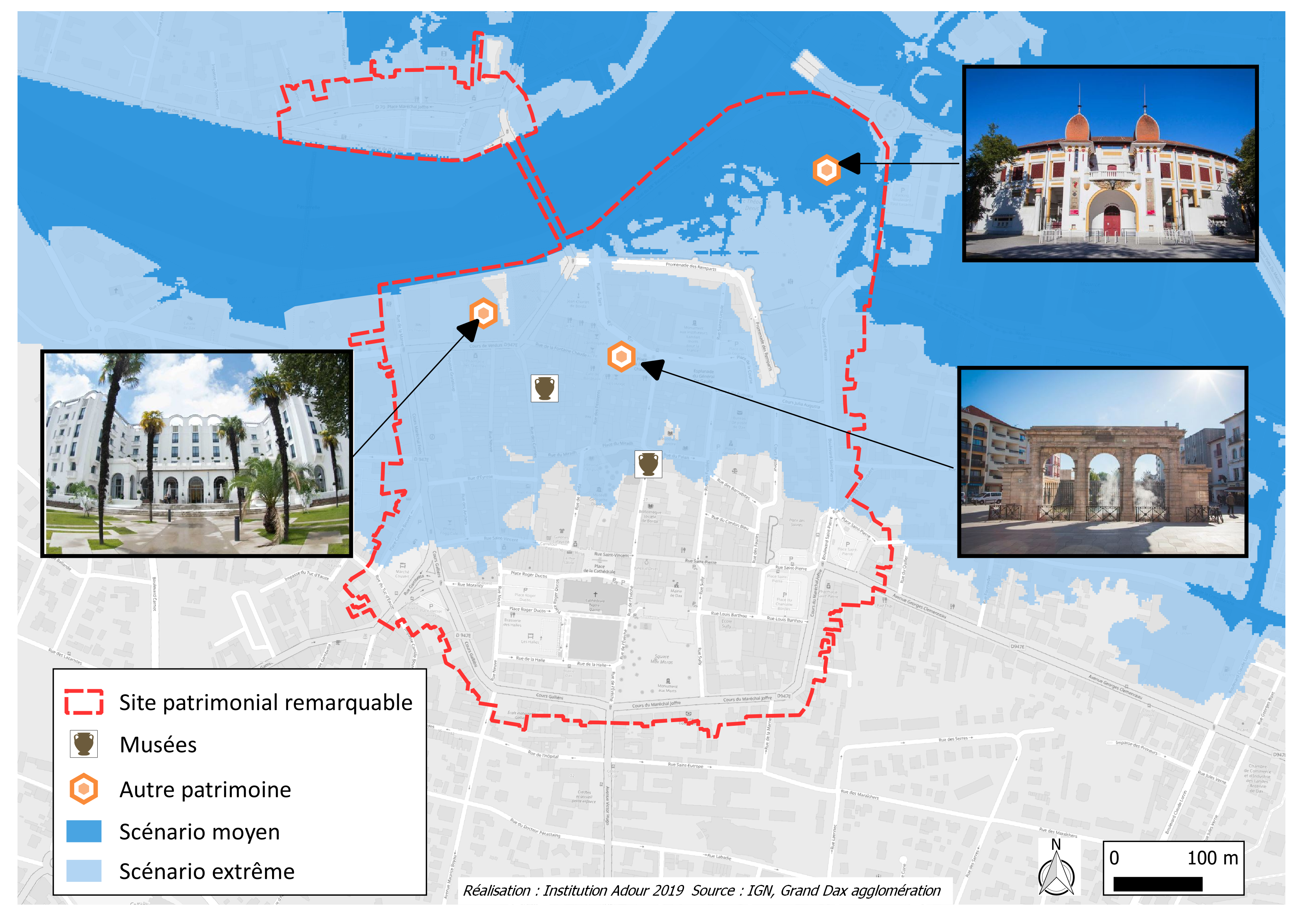 Le cœur urbain est caractérisé par un endiguement sur les deux rives de l’Adour qui forme un « goulet d’étranglement ». Ce secteur est marqué par une population importante et une activité touristique liée au thermalisme situées en zone inondable.