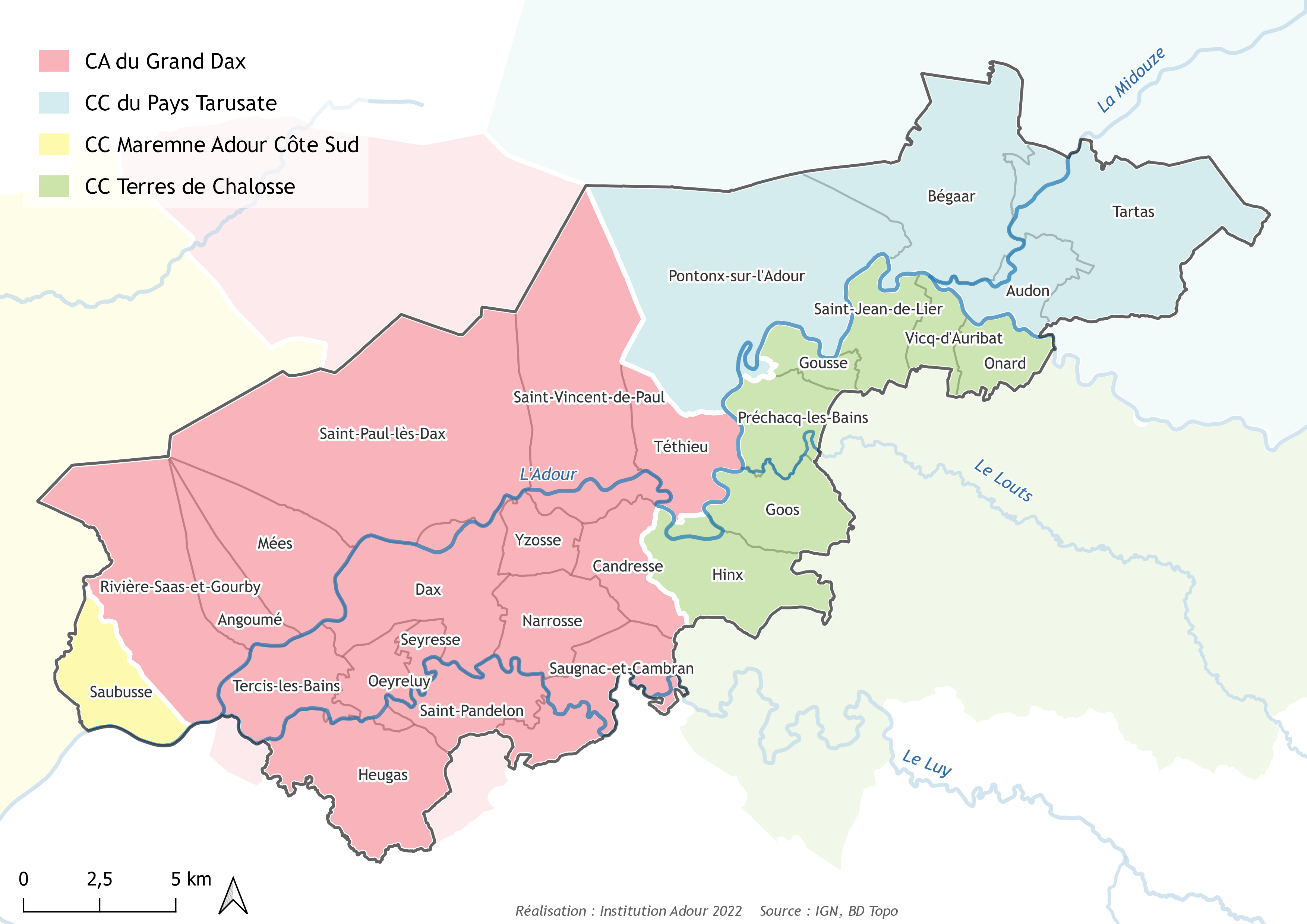 Dans un souci de cohérence hydrographique pour la gestion et la prise en compte du risque d'inondation et avec l'accord des collectivités concernées, il a été proposé d'intégrer dans le périmètre de la SLGRI les communes suivantes : Bégaar, Goos, Gousse, Heugas, Hinx, Pontonx-sur-l'Adour, Préchacq-les-Bains, Saint-Jean-de-Lier, Saint-Pandelon, Saubusse et Saugnac-et-Cambran.